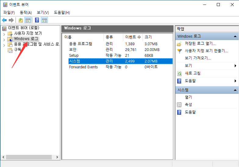 2 단계: 시스템뿐만 아니라 Windows 로그도 누르십시오.