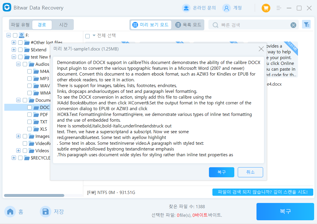4. 스캔 과정이 끝나면 필요한 파일을 미리 볼 수 있다. 이제 필요한 파일을 선택하고 "복구"를 누르십시오.